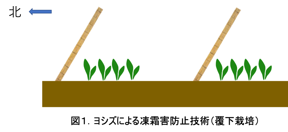 ここで先人の知恵を一つ紹介しよう。図1のように畝の北側にヨシズを立てて菜っ葉やカブを栽培する風景が、昭和40年ごろまで主に関東の冬の畑でよく見られた。昼は北風を防ぎ陽だまり効果で作物体温や地温が上昇する。夜は天空への放射冷却を防ぎ凍霜害を抑制する。ヨシズで天空の半分を覆えば、放射冷却も半減する。覆下(おおいした)栽培と呼ばれ、ネット上の百科事典でも紹介されている。なお被覆材で遮光して玉露茶などを作る技術も覆下栽培と呼ばれるが、これも初めは霜よけが目的だった(詳しくはこちら)。